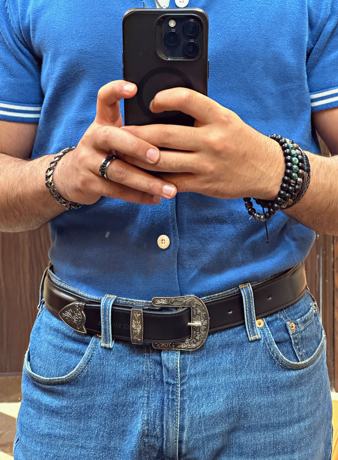 The Lawman: A Bold Statement in Black Leather with a Gleaming Silver Buckle